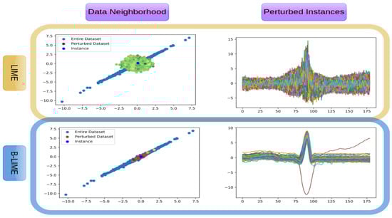 When generating disturbing data, time series data have special bonds between features that should be considered. However, as mentioned in Section 3.1., LIME generates random data points around the reference using the Gaussian sampling technique and ignores the correlation between features, resulting in unrealistic data points. To overcome these limitations, we propose a data generation technique that benefits from the ECG architecture and bootstrapping technique. Each ECG record generally contains a different number of heartbeats depending on time, frequency, and the patient’s heart rate. For example, record 100 from MIT-BIH is 30 min long, has a frequency of 360, and is segmented into 2271 heartbeats. Therefore, instead of using random perturbation techniques to generate data as in LIME, B-LIME segments the ECG record into heartbeats and then implements the bootstrapping technique to generate a resampling data point. Figure 3 illustrates the difference between the LIME and B-LIME perturbation techniques. As shown in the figure, the B-LIME is more faithfully localized to the neighborhood of the given instance (blue dot), and the generated data are more realistic to the original heartbeat.
