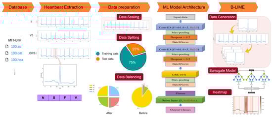 LIME has several packages that can provide explanations for various ML models. Moreover, LIME explanations mainly focus on two aspects: the ML algorithm and the type of dataset, i.e., tabular, texture, or image. Unfortunately, LIME does not have any packages to represent explanations of signal data. Therefore, the proposed B-LIME improves the LIME interpretation technique by providing explanations to signal data such as ECG arrhythmias. Figure 2 presents the B-LIME procedure to generate explanations.
