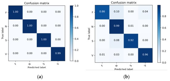 Moreover, the confusion matrix for each class of training and testing datasets, as shown in Figure 6, indicates the percentage of correctly predicted samples against incorrectly predicted samples for each class. For instance, 0.86 percent of the 195 cases in class F are correctly classified, whereas 0.10 percent and 0.04 percent, respectively, are incorrectly classified as classes N and V.