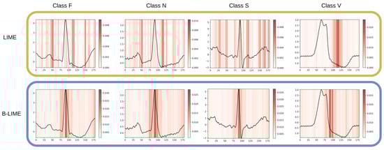 - Proposing B-LIME as an improvement of the LIME method for generating a credible and meaningful explanation of ECG signal data, taking into account the signals’ temporal dependency, and comparing performance to LIME.