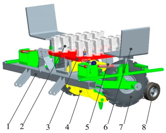 Three-dimensional model diagram of the transplanter. 1. Main beam; 2. feeding cup; 3. feeding mechanism; 4. planting mechanism; 5. planting depth adjusting for mechanism; 6. seat; 7. ground wheel; and 8. the earth-covering roller.