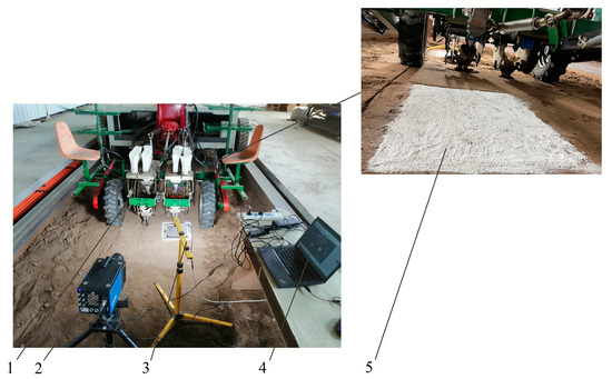 A high-speed photography system was constructed to record the soil disturbance behavior in real time during the test to study the dynamic changes in the soil at the contact interface. As shown in Figure 3, the system is mainly comprised of a high-speed camera, a LED light supplement, a laptop, and a hanging-cup transplanter. During field operation, the duckbill planter creates a particular disturbance to soil particles in the X, Y, and Z directions. This test only photographed and recorded soil disturbance at the Y–Z intersection to facilitate the recording. Without considering the sliding effect of the ground wheel, the soil tanker’s forward speed was set equal to the forward speed of the transplanter. Gypsum powder was used to outline a white marking area set in the forward direction of the transplanter. The high-speed camera was fixed on a tripod with the optical axis perpendicular to the horizontal section of the transplanter. The aperture and the height of the tripod were adjusted to ensure that soil disturbance could be photographed in its entirety. The distance between the lens of the high-speed camera and the plane where the transplanter was located was 1640 mm. The included angle with the horizontal plane was 43°, and the sampling frequency was 450 frames/s (image resolution: 1280 pixels × 1024 pixels).