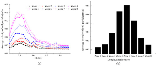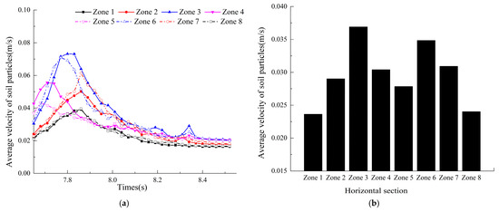 The variation in the soil disturbance velocity in each area of the horizontal section is shown in Figure 12. The test results show that the variation in the soil particle velocity at the longitudinal contact interface first increases, then decreases, and finally stabilizes. In addition, the velocities of zone 4 and zone 5 are relatively low. As shown in Figure 12b, the change in the velocities of zones 3 and 6 is much more significant than that of zones 4 and 5. The main reason for this result is that the duckbill moves to both sides during the hole drilling process. The closer the soil particles are to the outer wall of the duckbill, the greater the soil disturbance is and the more significant the change in soil particle velocity is.