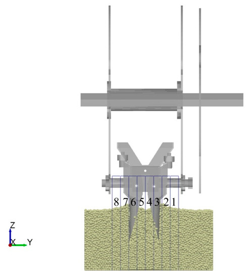 It is necessary to analyze the variation in the velocity of soil particles in the horizontal section under the action of the duckbill to study the interaction between the planter and the soil during the hole drilling process. Eight rectangular monitoring zones were set to monitor the change in soil velocity from the lowest point of the duckbill in the entire disturbed area to the point where it leaves the soil. As shown in Figure 11, the zones are numbered from right to left, and their size (length × width × height) is 22 × 550 × 260 mm.
