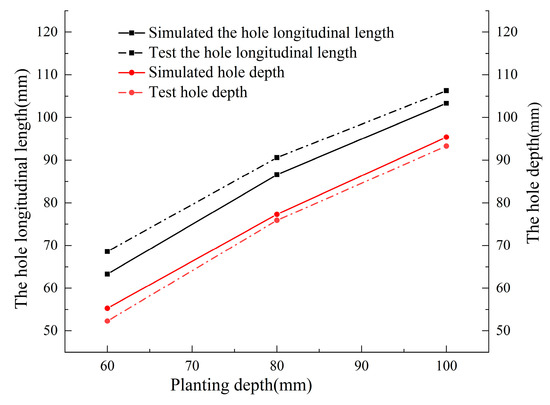 To analyze the influence of soil disturbance behavior on the hole longitudinal length and hole depth at different planting depths during the hole drilling process, soil bin tests and simulations were performed at various planting depths (H = 60, 80, and 100 mm) with a forward speed of v = 1.25 km/h. The test results are shown in Figure 13. When the forward speed of the transplanter is constant, the hole longitudinal length and hole depth increase gradually with the increasing planting depth. The main reason for this result is that the soil particle velocity of the horizontal and longitudinal sections increases gradually, while the soil disturbance changes considerably, ultimately affecting the hole-size parameters.