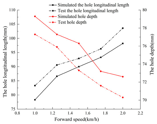 To analyze the influence of soil disturbance behavior on the hole longitudinal length and hole depth under different forward speeds during the hole drilling process, soil bin tests and simulations were conducted at varying forward speeds (v = 1, 1.25, 1.5, 1.75, and 2.0 km/h) at a planting depth of H = 80 mm. The test results are shown in Figure 14. The results of the simulations are consistent with those of the soil bin test results: when the planting depth is constant, the hole longitudinal length gradually becomes more significant, while the hole depth decreases as the forward speed increases. The main reason for this result is that the soil particle velocity of the horizontal and longitudinal sections increases gradually. The soil particles flow back into the hole, causing the hole bottom to be uneven, and ultimately affecting the hole-size parameters.