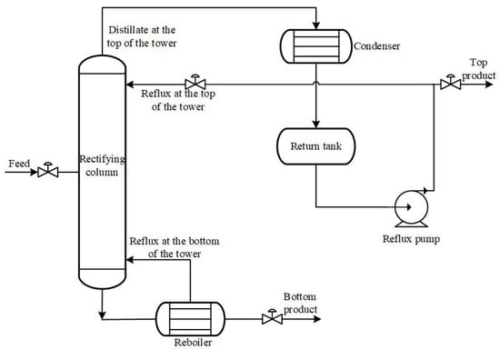 Distillation is the most widely used mass transfer operating unit in petroleum refining, petrochemical, and other industrial processes. It is also one of the most energy-intensive unit operations in petrochemicals. Figure 1 shows the structure of a typical distillation column. The energy consumption of distillation columns accounts for approximately one third of the total energy consumption of chemical plants. Statistics show that approximately 40~50% of the total energy consumption in the petroleum and chemical industry is consumed by the distillation process [1]. Therefore, improving the efficiency of the distillation process greatly impacts on the energy conservation and emission reduction of the chemical process, which cannot be realized without an efficient modeling and control method [2,3].