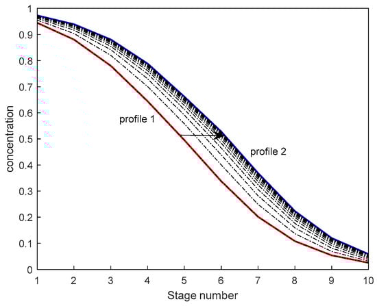 According to Equation (9), the concentration distribution of each tray has a fixed descriptive function form. The parameters (, , and ) in the formula would certainly vary with time during a dynamic process, but the formula structure does not change. Now, we transform the system from the new coordinate to the old one. Letting , β = q3(q2 − q1), we can obtain the description function of the concentration distribution: