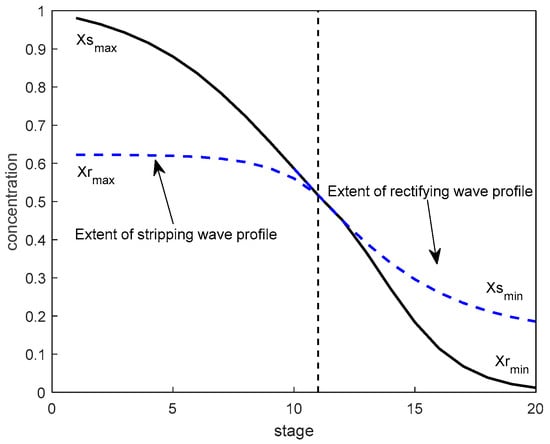 The parameters of the concentration distribution have physical significance, as mentioned above. Xr_max and Xs_max are the maximum approximate concentrations of the rectifying and stripping sections, respectively. Xr_min and Xs_min are the minimum approximate concentrations of the rectifying section and the stripping section, respectively. kr and ks represent the slope at the inflection point. For an intuitive representation, Case 2 in Section 3 is taken as an example here to describe the concentration distribution in the initial steady state and its expansion curve in the rectifying section and the stripping section, as shown in Figure 4.