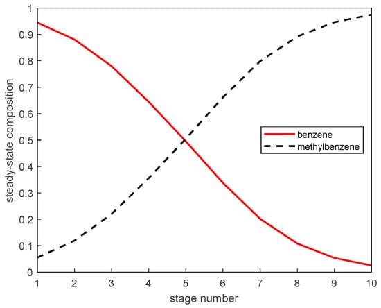 The specific operating conditions of Case 1 are shown in Table 2. Figure 6 shows the concentration distribution of the distillation column when it reaches a steady state under the above operating conditions. The purity of benzene at the top of the column is 94.5%, and benzene at the bottom of the column is 2.5%.