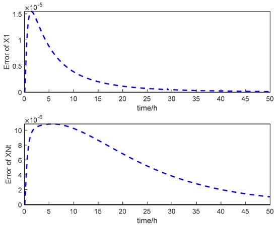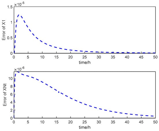 Figure 7 and Figure 8 show the concentration tracking errors between the proposed model and the mechanism model on the first tray and the n-th tray when the feed flow rate F and the feed composition Zf are increased by a step of 10%, respectively. As shown in the figures, the magnitude order of the errors stays in the range of 10−5~10−6, and the errors occur mainly at the beginning of the dynamic process and then approach zero gradually. Therefore, the tracking errors have little influence on the overall stability of the dynamic model, and the model has a high concentration observation accuracy.