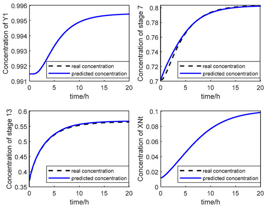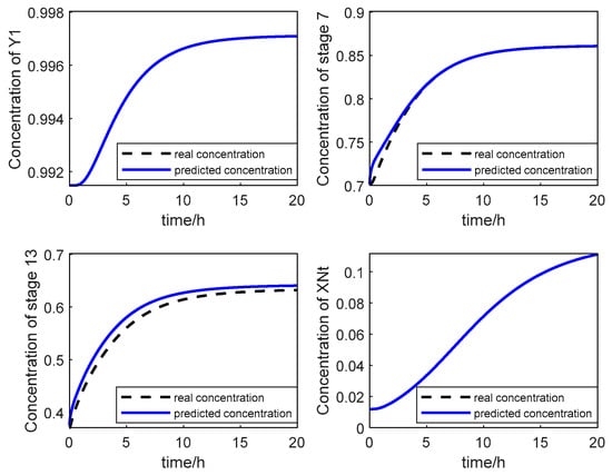 Figure 10 records the concentration observation of the dynamic model in the distillation column under the step change of the feeding composition Zf. It can be seen that the system has a pronounced fluctuation process. The situations are similar to the responses when F increases, except for the situation at the 13th tray. The 13th tray in the stripping section is close to the feed tray and therefore is easily interfered with by the feed flow. This factor leads to an obvious difference between the observed value and the actual value of the tray. However, the variation trend of the concentration is well depicted by the proposed model. The dynamic model can maintain high-precision concentration prediction at most of the trays, especially the top and bottom trays of the column, which are more critical in the control design than other trays.