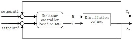 Generic model control (GMC) has the advantages of simple control structure, excellent nonlinear control performance, and easy parameter tuning, and is widely used in various fields [28,29]. In the GMC control scheme design of a distillation column, it is necessary to ensure that the concentrations at the top and bottom of the column reach their set values. Based on the proposed nonlinear model, the control of the top and bottom concentrations can be equivalent to the positions of the inflection points in the rectifying and stripping sections, respectively, because the concentration curve keeps a relatively unchanged shape. Therefore, the concentrations at both ends should have a certain relationship to the inflection points at the middle part of the curve according to Equations (12) and (13). In the proposed model, the velocities of the inflection points are specific, as depicted in Equations (27) and (28), which represent the derivative of the inflection point positions. The GMC controller can effectively control the derivative of the controlled variable to achieve the requirements. Therefore, GMC can be directly embedded into the nonlinear model without introducing other approximation links, which significantly improves the robustness and effectiveness of the control scheme.