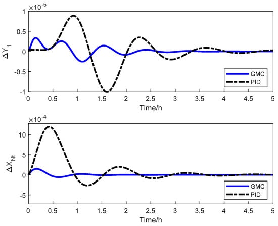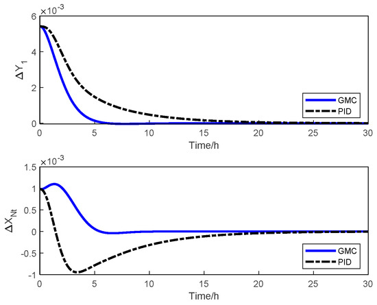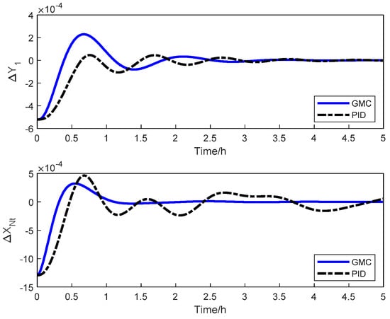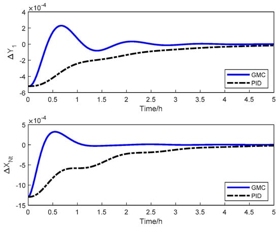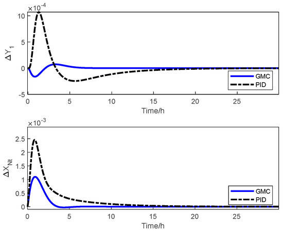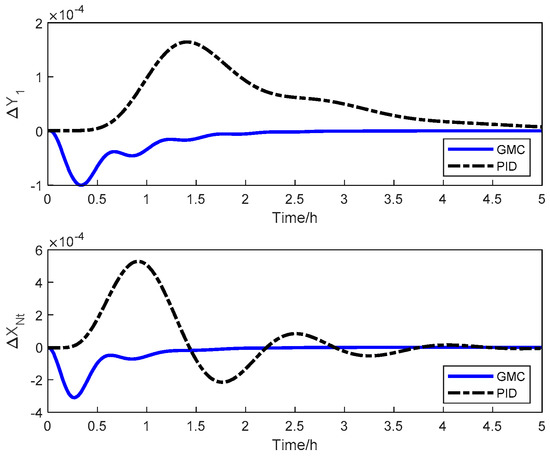 First, we take the example in Case 1 as the research object to carry out the control simulation experiment. The GMC controller based on the equilibrium theory model is compared with a traditional PID controller. The PID control scheme adopts proportional and integral control (PI controller), including two loops, respectively, to control the product concentration at the top and the bottom of the column. It is assumed that the set value of the concentration at the top of the column is Y1*, and the set value at the bottom is Xn*. To clearly represent the changes of controlled variables, the ordinate in the resulting chart is expressed as follows: ΔY1 = Y1 − Y1*, ΔXn = Xn − Xn*.