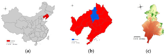 Study area. Subfigure (a) is the region of China, subfigure (b) is the region of Liaoning Province, and subfigure (c) is the region of Shenyang City.