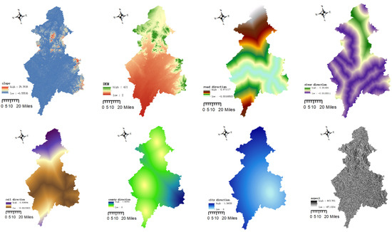 First, the driving factors of land use change should be processed. The number of driving factors comes from Resource and Environment Science and Data Center. The driving factors include the elevation data, slope data, aspect data, the distance to the nearest river, the distance to the nearest highway, the distance to the nearest rail, the distance to the nearest city and the distance to the nearest county. All drivers were collected in 2010. The data types are shown in Table 1. And tif is a format of geographic information file. The Euclidean distance is calculated in ArcGIS 10.8, as shown in Figure 3.