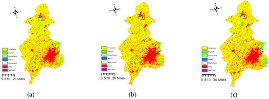 (a) Natural development scenario; (b) economic priority scenario; (c) forestry carbon sink scenario.