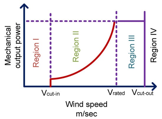 Wind Turbines (WTs) are majorly classified into two categories, such as Fixed-Speed WTs (FSWTs) and Variable-Speed WTs (VSWTs). However, VSWTs have many advantages over FSWTs. For instance, the VSWTs produce more annual energy yield than FSWTs []. In VSWT, Maximum Power Extraction (MPE) and transient load reduction are two significant factors. The operating regions of the VSWT are illustrated in Figure 1. In Region I (below cut-in wind speed), the available power in this region is lower than the WT losses. For this reason, the turbines are at a standstill condition. At below-rated wind speeds (Region II), WT extracts maximum power from the wind while reducing mechanical loads. In this region, the generator torque acts as a control input to the WT with an optimal pitch angle. In Region III (above-rated wind speed), the turbine limits the power capture at a rated value to protect against damage to the turbine. In this region, the pitch angle acts as a control input to the WT. Finally, Region IV refers to the above cutoff wind speed, and the turbines are at a standstill to avoid damaging turbine components.
