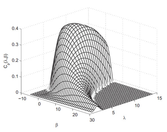 Figure 2 depicts the power coefficient of the WT considered for this work. The surfaces of this figure were obtained using the blade element moment theory, which was implemented in the WT performance code and developed by NREL [,]. Finally, the look-up tables were utilized to execute these surfaces in the mathematical model of the WT.