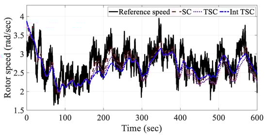 The main aim of the controllers is to optimize MPE while simultaneously reducing torque variations in the generator. Furthermore, torque variations could lead to increased mechanical stresses on the turbine. Consequently, optimal tracking of the rotor speed is impossible due to the rotor dynamics. Thus, intermediate tracking dynamics must be chosen to balance energy capture with reducing dynamic loads. Figure 6 and Figure 7 show the comparison of the rotor speed of all controllers. According to these figures, conventional and proposed controllers closely track the reference speed. However, the amount of control input required for an adequate tracking response must be considered to evaluate controllers. Furthermore, the effectiveness of the controllers depends not only on the MPE, but also on the standard deviation (STD) of the and . The following criteria have been considered to evaluate controllers: electrical and aerodynamic efficiency, STD, and maximum value of and . Equation (41) is used to find the electrical and aerodynamic efficiency.