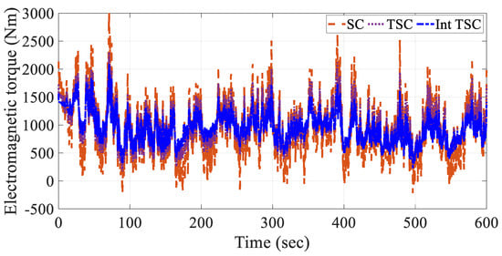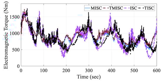 Figure 8 and Figure 9 represent the electromagnetic torque of the conventional and proposed controllers. From these figures, one can see that conventional controllers introduce numerous oscillations in the control input. The designed torque with SC, TSC and Int TSC is longer than the proposed controllers. It shows that these controllers have substantial effects on the drive train. Therefore, the mechanical stress delivered by these controllers is greater than the proposed controllers. At the same time, the proposed controllers have a comparatively lesser variation in the control input. A detailed comparative study of conventional and proposed controllers is presented in Table 1. In this table, TSC and TISC have the highest and lowest electrical efficiency, respectively. Although TSC has the highest efficiency, the STDs of and are higher than the proposed controllers. In addition, examining Table 1, the STDs of and of SC and TIMSC have the highest and lowest out of the other controllers, respectively. It implies that the transient load on the drive train for TMISC has lower variations than others. A reasonable trade-off should be made between energy extraction and load reduction. Therefore, this analysis concludes that the proposed TIMSC is an acceptable control scheme compared to other controllers, although it has a little less efficiency than ISC.