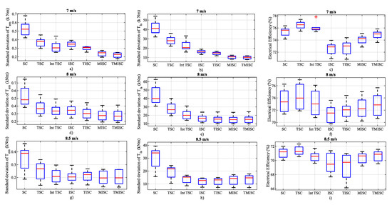 Figure 10 shows a boxplot for the proposed and conventional controllers for various spectral models and mean wind speeds. The evaluation of the controllers was examined on the basis of the electrical efficiency and STD of and . Initially, the controllers were tested with a mean wind speed of 7m/s and different spectral models and intensities. According to Figure 10a,b, TIMSC and SC have the lowest and highest STD of and , respectively. It indicates that TISMC can minimize the oscillation in the control input and drive train in the presence of the different spectral models and intensities. By examining Figure 10c, the electrical efficiency of TSC is the highest among all the controllers, but this controller introduces more oscillations than TISMC. However, ISC, TISC and MISC have the lowest STD of and than conventional controllers. Subsequently, the electrical efficiency is lower than that of TMISC. This analysis concluded that, at an average wind speed of 7 m/s with various spectral models, TISMC performs better than other controllers.