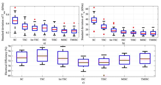 Figure 11 depicts a boxplot for the overall performance of the controllers. In the figure, 24 wind speed profiles are utilized to determine the overall effectiveness of the controllers. Figure 11a–c presents the overall STD of , and electrical efficiency. It demonstrates that despite different spectral models and mean wind speeds, the TMISC has the lowest STD of and among other controllers. The performance of MISC is almost similar to that of TMISC because the overall performance of these two is identical with respect to the control input and oscillation in the drive train. However, considering the electrical efficiency, the TMISC is higher than the MISC. Thus, a fair trade-off has to be made between electrical efficiency and drive train oscillations. Therefore, at high wind speeds (near rated wind speed), the controllers, such as MISC and TISMC, perform similarly, whereas at low wind speeds (near cut-in wind speed), TIMSC performs better than MISC.
