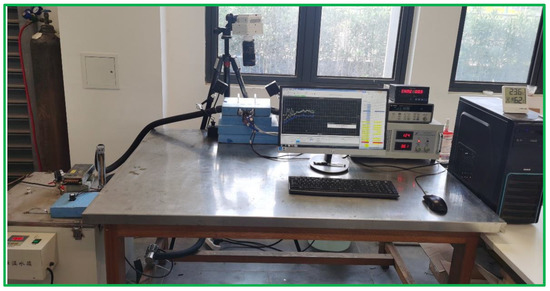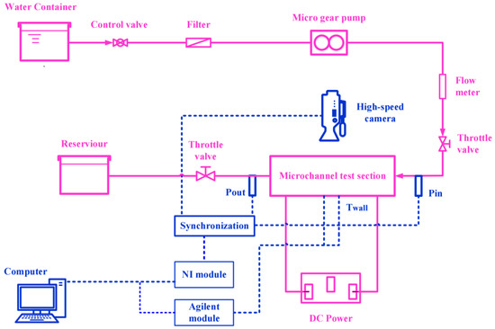 The experimental system is mainly composed of pipe unit, electric heating unit and data-acquisition unit, as shown in Figure 1 and Figure 2. The pipe unit includes the deionized-water tank, micro gear pump, flowmeter, microchannel testing section, and terminal collection reservoir. After cooling to a preset temperature, the degassed and deionized water in the tank is driven to the microchannel test section by a micro gear pump (MG200XK/DC24W). In the sintered porous microchannel the liquid water is converted into the liquid–vapor two-phase state, and finally collected by the terminal collection reservoir. A copper block is used as the simulated heat source. Six electric-heating rods (6 × 250 W) are powered by an adjustable DC power supply (Voltage range: 0~300 V; Current range: 0~10 A). The flow rate was measured by a micro-turbine-type flow meter (FHK 937-1510), ranged from 1 to 10 L/h, with an uncertainty of ±1%. Liquid temperatures of inlet and outlet of test section are measured by the two PT100 sensors (I-class accuracy, ±0.3 K), respectively. Temperature measurements of the copper block are conducted by armored T-type thermocouples (I-class accuracy, ±0.4 K). Two pressure sensors, PX309-015G5V, are responsible for the measurement of inlet and outlet pressure, with a range of 0~15 psia (Relative pressure). The pressure data are gathered by the NI PCI-6212 module, and temperature data by Agilent 34901A. All measurement data are transferred to the computer for real-time display. Phantom VEO E-310L is applied to capture the boiling flow pattern at an image capture rate of 2800 frames/s and resolution of 1280 × 800 pixels. Synchronous acquisition of pressure sensor and high-speed camera is performed to acquire the dynamic evolution of flow pattern in detail. Before each test, Nitrogen gas should be filled into the test section to check its sealing degree.