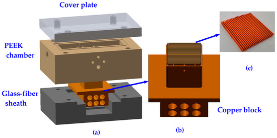 The microchannel test section in Figure 3 mainly includes a transparent PC cover plate, PEEK chamber, copper block and glass-fiber adiabatic sheath. The upper part of the copper block is designed as a rectangular copper column to ensure one-dimensional thermal conductivity (three temperature-measuring holes are arranged longitudinally along the center line to monitor the input heat flux), and six heating-rod holes are evenly arranged in the lower part. The exterior of the copper block base is wrapped with glass-fiber sheath, which greatly reduces the heat loss of the test section. The schematic diagram is described in Figure 4 about the sintered porous microchannel and copper plate. Structural parameters of the porous microchannel are displayed in Table 1. The footprint area of each sintered sample is 28 × 28 mm. It is composed of 23 microchannels. Each microchannel has a channel width of 600 μm, fin width of 600 μm and channel depth of 1200 μm. The porous microchannel sample is firstly sintered onto the copper plate surface (thickness: 5 mm) in the sintering furnace under the protection of Nitrogen gas.