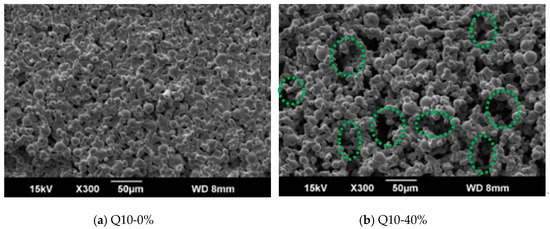 From Table 2 and Table 3, the addition of pore-forming agent does increase the porosity of the sample. The porosity of Q10-0% is only 20.4%, while the porosity of the Q10-40% sample can reach 52.8%. The porosity of the Q30-40% sample is 47.5%.