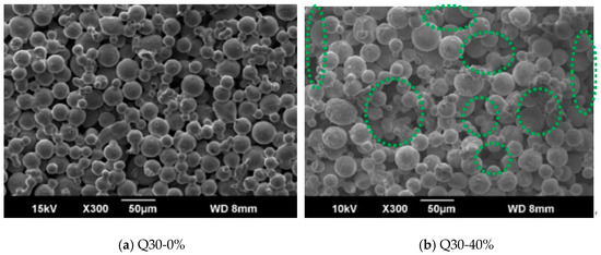 Figure 5 shows the micro-structures of both Q10-series samples under different PFA contents, obtained by GeminiSEM 360. Compared with Q10-0%, Q10-40% not only increases the porosity of the sample, but also forms a kind of dual-pore morphology: large pore more than 50 μm, and small pore below 10 μm. Some large PFA particles, after clearing out, create large voids inside the sample, as marked with dotted green circle. Some copper particles agglomerate together to form a cluster structure. Micro-structure images of both Q30-series samples are compared in Figure 6. A large void structure is also commonly observed, but not as obvious as Q10-40%. Cluster structure is difficult to be sought out. This is attributed to the proximity between the PFA particle size and copper particle size. The PFA sintering method increases the porosity and alters pore morphology certainly.