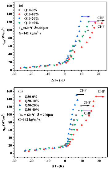 The PFA content has a certain influence on the flow boiling process in the sintering microchannel, especially critical heat flux (CHF). Figure 14a,b reveals the correlation between the two. Figure 14a displays the CHF variation in Q10 series. Q10~20% achieves relatively higher CHF, more than 140 W/cm2. Figure 14b shows the measured CHF values of Q30 series. Both Q30-10% and Q30-20% show a high CHF of 160 W/cm2. For both series, samples of 40% PFA content present a great decrease in CHF. This demonstrates that too large porosity is not conducive to the promotion of CHF.