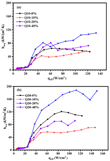 The corresponding HTC curves of each sample are shown in Figure 8a,b. Heat transfer coefficients versus heat fluxes are illustrated in Figure 7a for the Q10 series samples. As the heat flux is less than 20 W/cm2, HTCs show an almost constant single-phase state. After initiation, HTCs increase rapidly with heat fluxes. Q10-20%, with moderate PFA content, achieves a higher HTC level. The maximum HTC of Q10-20% reaches up to 112.4 kW/(m2·K). However, for the sample without PLA, HTCs would decrease after moderate heat fluxes.