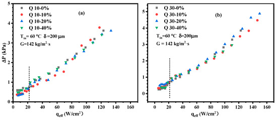 Figure 9a,b shows measured average pressure drops of Q10 and Q30 series samples. The overall trend of the average pressure drops increases with the increase in heat fluxes. The incipience point of the two-phase state is marked with a dotted line in the figure to distinguish the single-phase state. When the heat flux is less than 20 W/cm2 all porous microchannels stay in the single-phase flow state. The pressure drop increases slightly with increasing heat flux. After the boiling incipience the average pressure drop is almost proportional to the heat flux. Q10-10% shows slightly higher pressure drop in each series. In general, the addition of PLA has a minor impact on the average pressure drop and would not cause a significant increase in the two-phase pressure drop.
