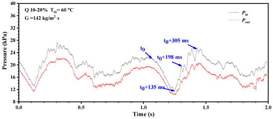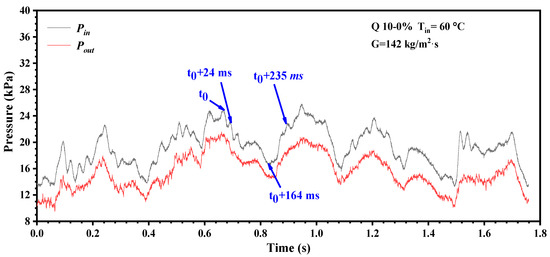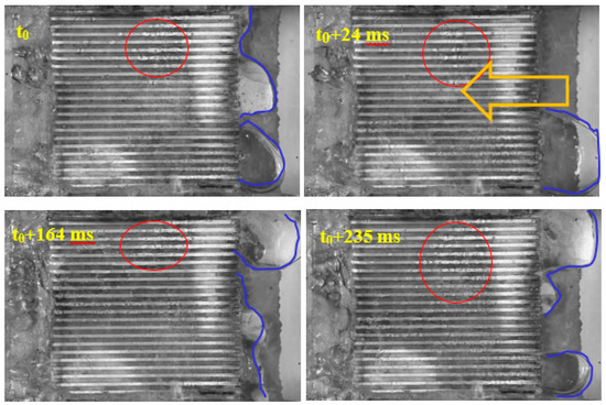 Figure 12 shows pressure fluctuation at the inlet and outlet of the Q10-20% sample at G = 142 kg/(m2·s) and q = 121.2 W/cm2. Distinct from that of Q10-0%, the pressure curve of Q10-20% presents a quasi-periodicity. The addition of PLA with a volume ratio of 20% improves the flow instability. The corresponding visual observation is shown in Figure 13. At t = t0, the inlet and outlet pressure reach the highest value, and inlet region is completely covered by a large vapor mass produced by evaporation, difficult for liquid to enter. At t = t0 + 135 ms, the inlet liquid reenters those downside microchannels and rewets the relevant region. Both inlet and outlet pressure also fall to the trough. After t = t0 + 198 ms, the liquid front has migrated to the middle region. Almost in the meantime, a new vapor pocket is growing up near the entrance, which leads to a new climb of inlet pressure. When t = t0 + 305 ms the vapor pocket is completely formed. The inlet pressure reaches the crest and the inlet liquid was blocked outside.