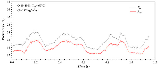 Both inlet and outlet pressure curves of Q10-40% are shown in Figure 14. The pressure oscillation curves also show a quasi-periodicity. The oscillation amplitude is estimated to be 12.0 kPa, lower than that of Q10-20%. However, average duration of its pulsation cycle is only 0.35 s, substantially shorter than 0.53 s of Q10-20%. It means a more rapid evaporation-rewetting cycle for the sample of Q10-40%. It is speculated that large porosity may be a crucial contributing factor to this change, but this needs to be explored further.