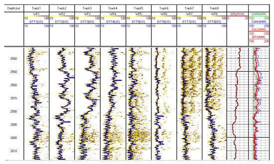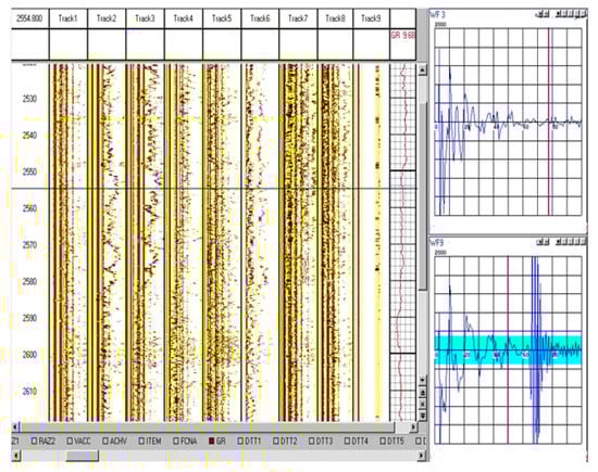An example of typical data is shown in Figure 3. The first column shows the depth, and the next nine are the phase correlation diagrams (WF 3–WF 9) for each sensor. The rightmost column shows the curve of natural GR gamma activity in μR/h. The wave pattern of the third channel at the depth marked by the cursor is displayed in the upper window, and the wave pattern of the reference sensor is in the lower window, on the right side of the figure. The shown wave pattern of the third channel is observed at the cavity boundary. Obviously, the reflection signals in the wave patterns of the measuring sensors are distorted by the reverberation noise of the sensors themselves (straight lines on the PCD). The shown wave pattern of the third channel gives a visual representation of the ratio of the useful signal and noise in the sections of the cavernous wellbore: the useful signal is not distinguished in the wave pattern. Its entry time (marked with a vertical cursor) is approximately equal to the entry time of the reflection on the reference channel, and the amplitude is 10 times less. Thus, direct measurement of the time of arrival of the reflected signal in the cavernous sections of the well is practically impossible.