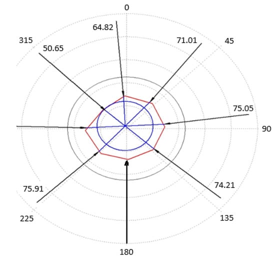 The blue contour shows the position of the lowered tool relative to the walls of the well, and the red contour is the profile of the well obtained by eight sensors by means of wave reflection.