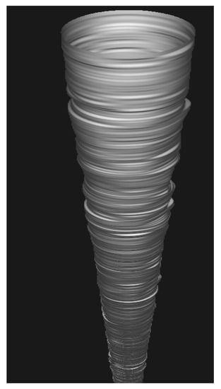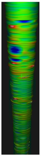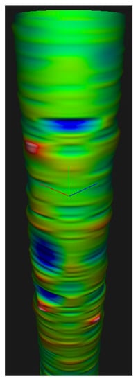 For a three-dimensional representation of the input data, it was necessary to obtain a three-dimensional geometry with the preservation of attribute data. To facilitate and speed up the process of converting data from a plane to 3D, it was necessary to create an additional software module that allows the convolution of flat data into a cylinder for a given center and radius (the well model based on real data is shown in Figure 18, made by authors). It should be noted that the resulting 3D geometry is stored in the true coordinate system, which allows combining the results with other data at any time.