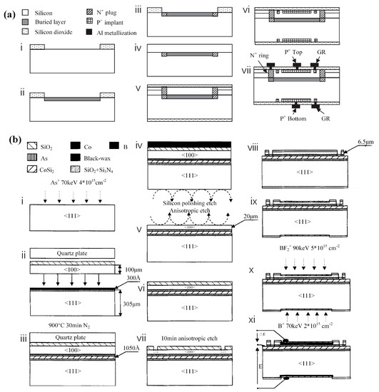 To manufacture this integrated detector structure, one method is to use a high-energy particle injection to form a conductive buried layer as the common electrode of the thick PIN detector and thin PIN detector [8,9,10], then conduct low-energy particle injection doping to form another electrode of the thick and thin PIN detectors, wherein the conductive buried layer uses another injection doping extraction electrode. The second method is to make thick PIN detectors by diffusion doping, then make thin PIN detectors by epitaxy, [18,19] (the process flow is shown in Figure 3a [18]). Another method is to use cobalt silicide as a conductive buried layer to form a ΔE-E nuclear radiation detector. The process flow is shown in Figure 3b [11]. However, these methods have many problems, such as the complex process, great difficulty and inability to ensure the process success rate. A novel integration method is to use bonding technology to realize the integration of thick and thin PIN detectors. This method can effectively reduce the package volume and weight, but there are certain requirements for achieving the bonding conditions. For example, high temperature and high pressure are likely to cause the failure of silicon PIN radiation detectors, and a longer bonding time is not conducive to the improvement of production efficiency.