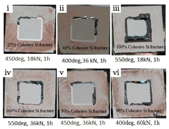 At present, Tong [28] reported a method of room-temperature metal direct bonding in air between aligned metal posts on oxide-covered silicon wafers without externally applied pressure or force. That is, a thin layer of gold is deposited on the metal column to achieve room temperature bonding of metal columns other than gold. Different from this method, some researchers have added ion sputtering technology on the basis of process optimization. For example, Kurashima et al. [29] used the hot embossing process to press the surface grinding tool onto the metal film on the wafer at a high temperature. After the metal surface had been flattened, the Ar beam was used to activate the metal surface to achieve bonding at room temperature. Higurashi et al. [30] carried out bonding by contact under ambient air, and applied static pressure after cleaning the surface of the Au film with Ar radio frequency plasma. At the bonding temperature of 100 °C, the die-shear strength exceeded the failure criteria of MIL-STD-883. Based on the process optimization, these provide a certain technical reference for Al–Al metal low-temperature bonding. In the series of studies on Al-based metal bonding schemes, the American Analog Devices Company applied a pressure of 30 MPa at the bonding temperature of 445 °C to achieve Al ring bonding with a width of 4–90 μm [31]. Further, they achieved Al ring bonding with a width of 3–150 μm on the wafer [32]. Dragoi et al. [33] of EV Group Australia investigated the effects of the bonding temperature, bonding time and bonding atmosphere on the quality of Al–Al bonding. Malik et al. [34] compared the dicing yield of Al–Al bonding and the cohesive Si fracture results obtained under different bonding temperatures and pressures, and found that strong Al–Al hot-pressed bonds can be obtained at 450 °C or above. Further, Malik et al. [27,35] performed Al–Al direct bonding at the bonding temperatures of 400, 450 and 550 °C, respectively, under different bonding forces. Their results revealed that, under experimental bonding conditions, the bonding strength increased with the bonding temperature and bonding force. Figure 4 shows the failure surface photos of typical Al–Al-bonded samples prepared under different bonding temperatures (400–550 °C) and bonding pressures (18–36 kN; converted bonding pressures: 34–69 MPa). Generally, Al–Al bonding requires high temperature, high pressure and long bonding time. However, high temperature and high pressure may cause the failure of the silicon PIN radiation detector, and longer bonding time is not conducive to the improvement of production efficiency. Therefore, the influence of primary oxides, surface roughness and other materials should be further investigated with regard to achieving successful bonding at a lower temperature.