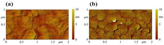 The native oxide layer, with highly stable chemical properties on the aluminum surface, cannot be removed by conventional methods [36]. The stable oxide layer acts as a barrier and it inhibits the diffusion of Al atoms on the bonding interface [37]. Generally, effective Al–Al wafer bonding requires a processing temperature above 300 °C and higher contact pressure. To avoid the influence of primary oxide produced by Al in the bonding process, a feasible solution is to adopt a dry surface pretreatment process for the removal of primary oxides. For example, Hinterreiter et al. [38] used Ar plasma treatment to remove surface oxides while processing the wafer under an ultra-high vacuum, and achieved the Al–Al bonding of amorphous wafer pairs at 150 °C. Atomic force microscopy (AFM) images of the Al wafer surfaces for standard deposition and the aluminum low pressure seed (ALPS) wafers are shown in Figure 5a,b. Schulze et al. [37] modified the etching mask during the wafer manufacturing process to improve the quality of the aluminum bonding pad surface and achieve improved bonding. At temperatures as low as 250 °C, they achieved a high bonding yield of >85% and contact resistance in the mΩ range. Based on the results obtained by several groups of wafer bonding experiments, Rebhan et al. [36] found that a wafer with a blank Al film can reduce the bonding temperature to 150 °C, while a wafer with a frame Al pattern can reduce the bonding temperature to 100 °C.