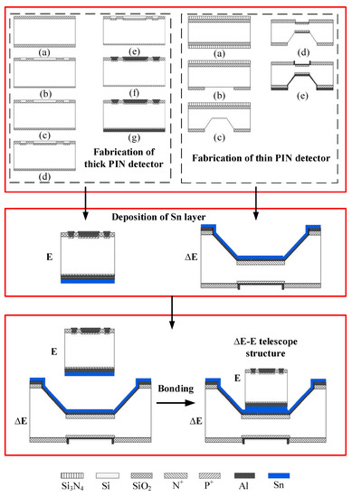 - Zhu, Z.; Yu, M.; Jin, Y. Fabrication of integrated silicon PIN detector based on Al-Sn-Al bonding for ΔE-E telescope application. Microelectron. Eng. 2021, 247, 111599. [Google Scholar] [CrossRef]