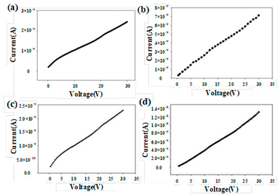 The typical fabrication processes include: First, thick PIN detectors and thin detectors were fabricated with Al electrodes. Then, the PIN detector is attached to the silicon wafer by a photoresist, and the photoresist is cured by heating. After that, the detectors are placed in the PVD cavity for in situ Ar plasma sputtering cleaning to remove native aluminum oxide. Then, put the Sn layer in the same vacuum chamber and sputter it onto the aluminum layer in situ. After the Sn layer was deposited, the samples were placed in lactone to dissolve the photoresist. After drying with nitrogen, a PIN detector with an Sn layer was obtained. After that, the thin and thick silicon PIN detectors were stacked. The devices were pressed together at a force of 7.5 N in a vacuum chamber at 9 × 10−4 mbar and heated to 330 °C, followed by immediate cooling to avoid the obvious impact of the bonding process on PIN device quality. The detectors were successfully bonded and taken out from a wafer bonder at 200 °C. Figure 6 shows the fabrication steps of an integrated PIN detector structure based on Al–Sn–Al bonding. After testing, there is no significant difference in the electronic performance of thin and thick silicon PIN detectors before and after bonding, and the Al–Sn–Al bonding integration technology has sufficient mechanical strength. The reverse I-V characteristics of typical silicon PIN detectors are shown in Figure 7a,b. Figure 7c,d shows the reverse I–V curve of typical bonded 300 μm and 100 μm-thick PIN detector structures. The success of this bonding method provides a certain reference value for subsequent detector integration by optimizing the interlayer materials, reducing the surface roughness and removing the surface oxides.