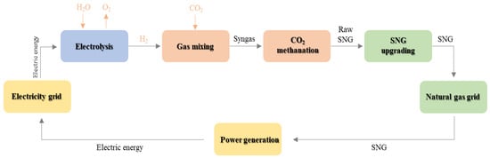 Therefore, it is possible to produce SNG (synthetic natural gas) through the CO2 methanation reaction by utilizing the large amount of CO2 generated in various indus-tries and divert it towards the existing natural gas supply infrastructure. A process ap-plying this concept is the power-to-gas(P2G) project [14,15]. P2G is a technology that produces H2 by water electrolysis using surplus power or converts the produced H2 into CH4 by reacting with CO2 thereby using it as a fuel for heating, power generation, transportation, etc. (Figure 1). While the existing method of energy storage is to store the produced power in secondary batteries, P2G may be distinguished from the existing large-capacity energy storage systems as a way of storing the produced power in the form of gas fuel [5].