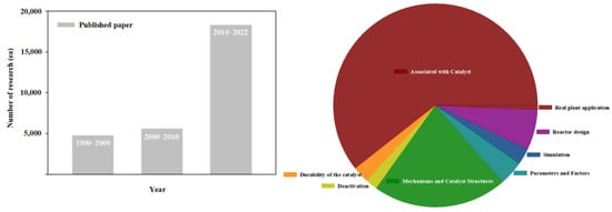 Owing to the advantages of these technologies, studies on CO2 methanation have become more diverse. Based on the academic information search provided by the Google portal, as a result of investigating papers published in related research fields from 1990 to 2022 (Figure 2, left), In particular, active research has been conducted since 2010. Figure 2, right shows the fields of CO2 methodology studied over the past 10 years (2012–2022). It also shows that many scientists have studied various aspects of the technology, such as catalyst manufacturing, low-temperature operation, durability improvement, reactor type, mechanism, and computational chemistry, to increase the efficiency of the reaction [16,17,18].