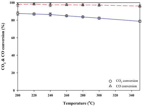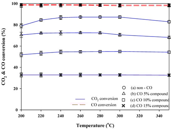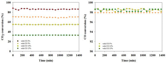For CO conversion, it showed a high methanation reaction of 98–99% under all conditions of Figure 4b–d at 350–200 °C, but for CO2 conversion, it was lower as the CO concentration increased in order as seen from Figure 4b to Figure 4d.