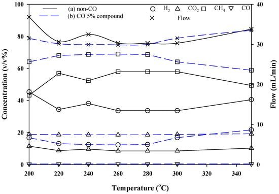 First, with respect to the CO2 conversion, a higher conversion of 79% to 88% was observed as the temperature decreased from 350 °C to 200 °C, as shown in Figure 7, indicating a high conversion rate similar to the trend of (a) in Figure 4 where CO was not injected. On the other hand, CO conversion showed a high conver-sion rate of 97% or more over the entire temperature range. Therefore, the gas produced by high conversion of CO2 and CO contained a high content of methane and a small amount of unreacted gases (CO2, CO, and H2) as seen in Figure 8. As shown in Figure 8, the appearance of the concentration of outlet gas was H2 20.8%, CO 0.73%, CO2 5.13%, CH4 73.4% (200 °C, N2, H2O removed). A tendency for CH4 production to increase due to high COx conversion at low temperatures was observed.