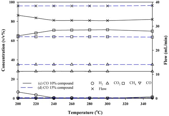 The composition of gases produced according to CO gas concentration (0–15%) in the CO2 methanation reaction (2): (c) with CO 10% (d) with CO 15% (Total inlet gas 120 mL/min).