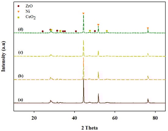 Therefore, EDS and XRD were analyzed to observe the catalyst surface and structure after a 24 h COx methanation reaction. EDS(Scanning Electron Microscopy) mapping and point analysis were conducted to observe the surfaces after 24 h of prolonged catalytic reaction, and the results are shown in Figure 10 and Table 3. As a result of EDS mapping analysis, the elements C, O, Ni, Zr, and Ce were qualitatively analyzed for all the catalysts A to D Through EDS point analysis, the content of elements is as shown in Table 3, and there was no significant difference in the content among the samples, as the amount of carbon on the surface was 11.31–14.8%. In addition, the Ni elements exposed on the surface were 53.77–54.99 in all of A to D, and it is considered that no loss occurred during the reaction. The XRD analysis results of A-D are shown in Figure 11. Ni, ZrO2, and CeO2 diffraction peaks were observed for all catalysts. It is observed that the intensity and width of the XRD diffraction peaks of the catalysts are similar. This indicates that there is no sintering in the reaction of the catalyst particles.